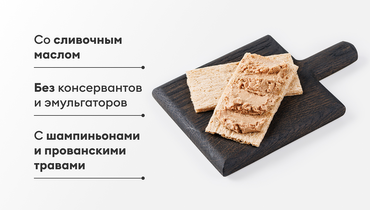 Дополнили куриный паштет шампиньонами и прованскими травами. Особенно нежный вкус он приобретает благодаря добавлению сливочного масла. Подходит для бутербродов и брускетт. Состав проверен: нет консервантов и эмульгаторов