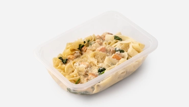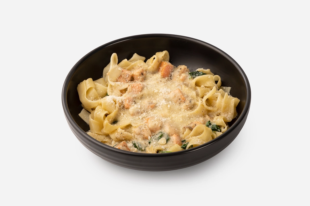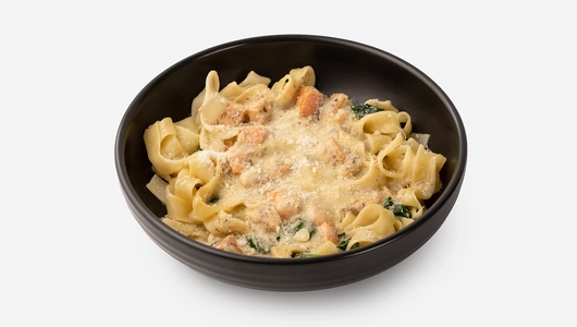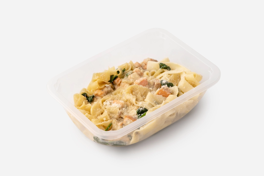Широкие ленты пасты в густом соусе с тимьяном и орегано подаются с кусочками форели и шпинатом. Соус готовим на сливках и сливочном масле с луком и чесноком для аромата. Ломтики копчёной форели добавляют солоноватый вкус и лёгкий дымный оттенок. А тёртый пармезан плавится, создавая бархатистую текстуру. Паста приедет горячей — можно сразу подавать, пока соус такой нежный и кремовый, а форель, пропитываясь ароматами, раскрывает свой вкус.