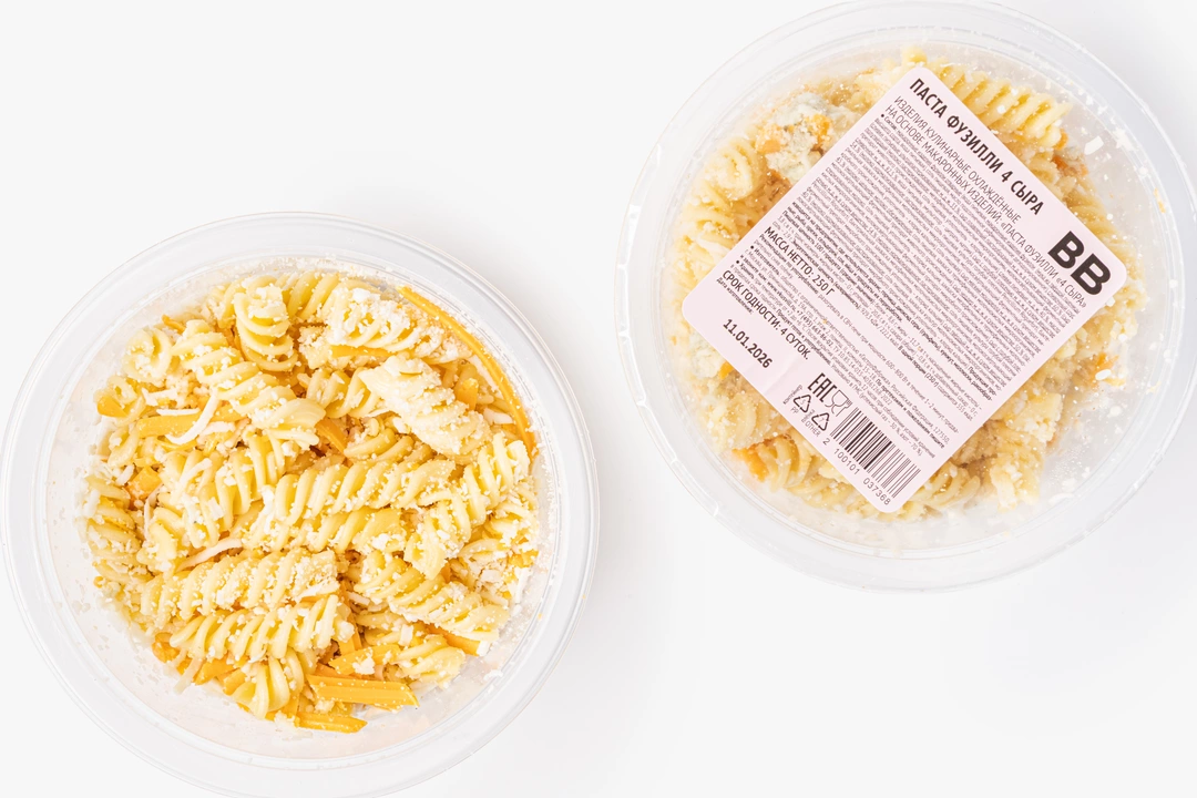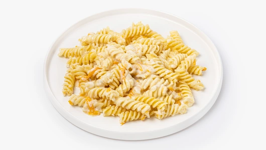 Тугие спиральки пасты в сливочном соусе с четырьмя видами сыра — это традиционное блюдо итальянской кухни. Мы приготовили соус на основе плавленого сыра и сливок, чтобы он получился нежным и бархатистым. Добавили к макаронам тягучую моцареллу, пикантный чеддер, сыр с голубой плесенью с лёгкими острыми нотами и твёрдый сыр с выраженным молочным оттенком. Пасту остаётся только разогреть и подать на стол со свежей зеленью как самостоятельное блюдо или в качестве гарнира к мясу или рыбе. Сытный и аппетитный ужин создаст уютную атмосферу у вас дома и порадует любителей итальянской классики.