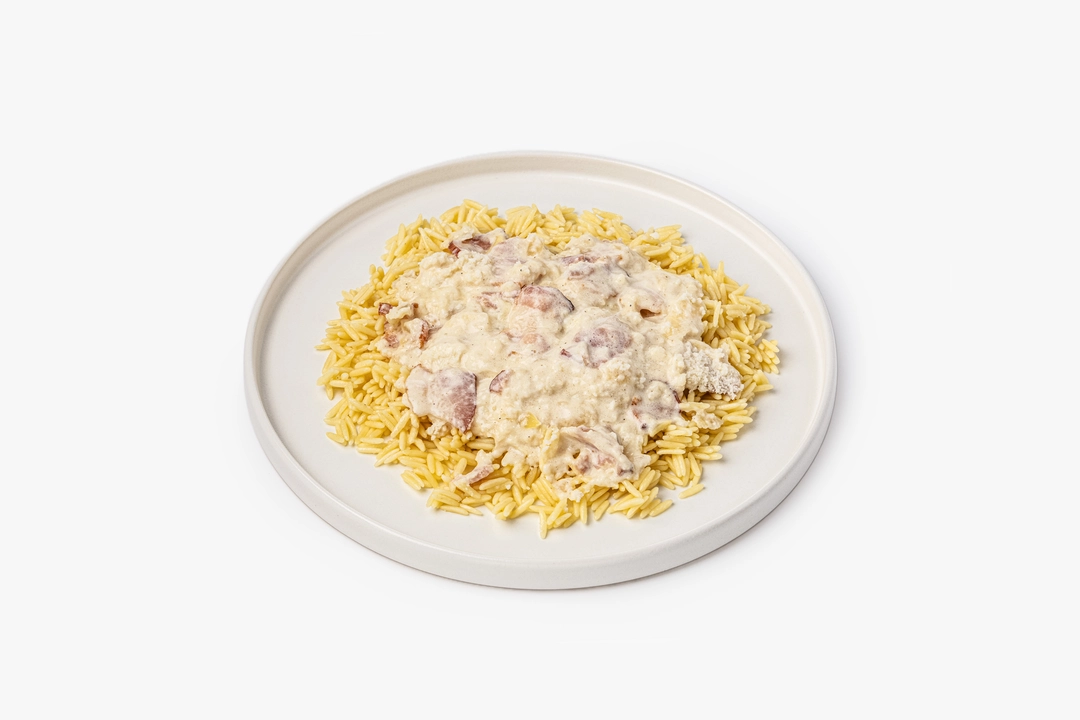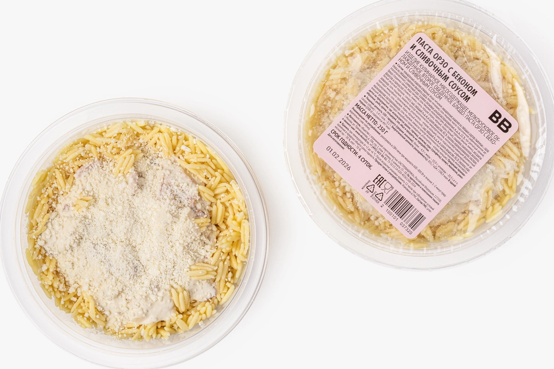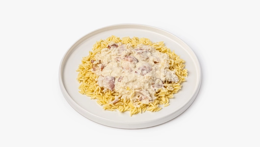 Орзо — это макаронные изделия из твёрдых сортов пшеницы в виде крупных зёрен, напоминающих рис. Мы отварили их, чтобы они сохранили приятную упругость, приготовили соус на основе сливок с луком и твёрдым сыром и добавили солоноватый бекон. Перед подачей на стол подогрейте блюдо, чтобы соус равномерно распределился и окутал каждое зёрнышко, а бекон стал ещё более аппетитным. Для аромата можно предложить свежую или рубленую зелень по вкусу. Такой ужин создаст у вас дома атмосферу уютного семейного ресторана в живописном итальянском квартале.