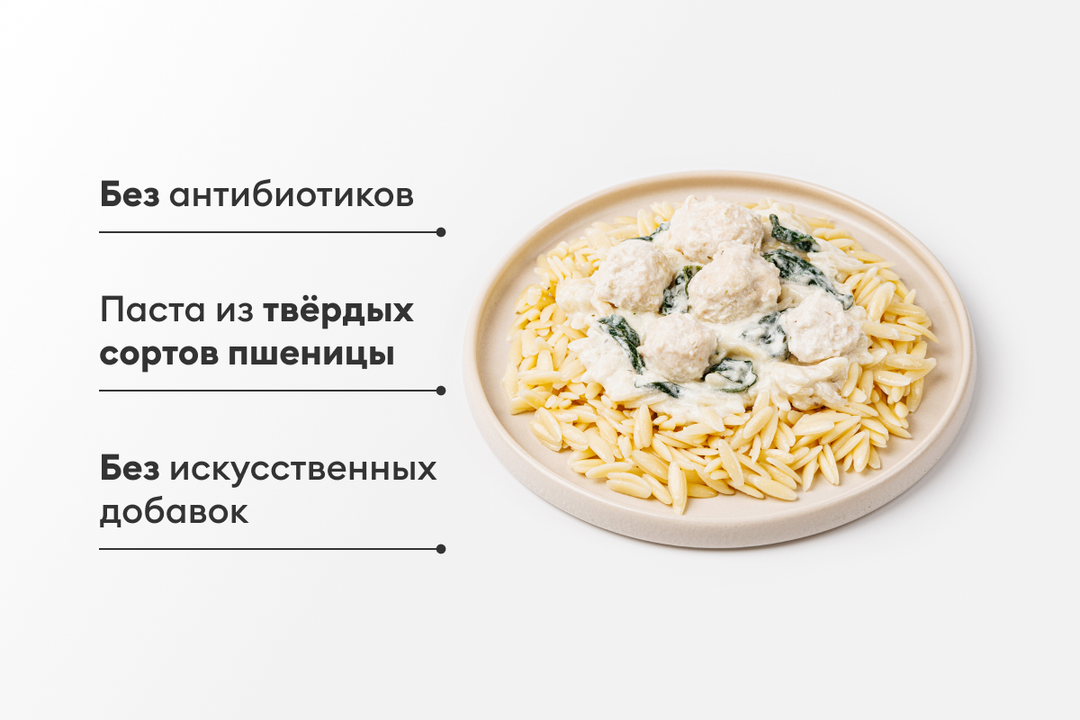 Взяли пасту орзо из твёрдых сортов пшеницы и добавили к ней нежные фрикадельки в ароматном соусе. Проверили состав: нет усилителей вкуса, консервантов и антибиотиков