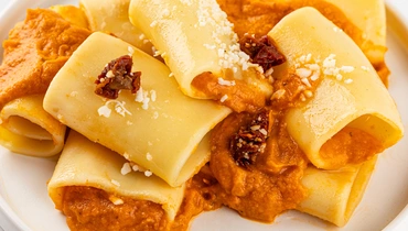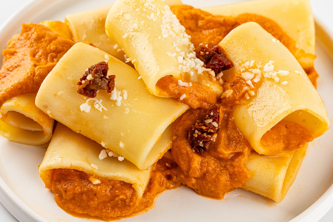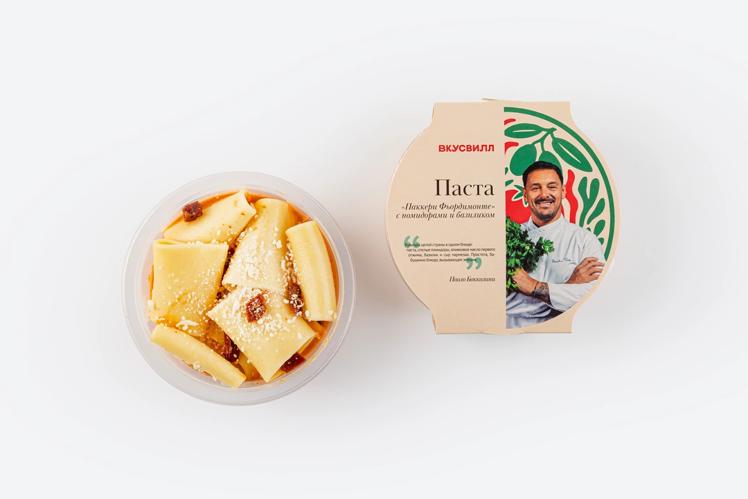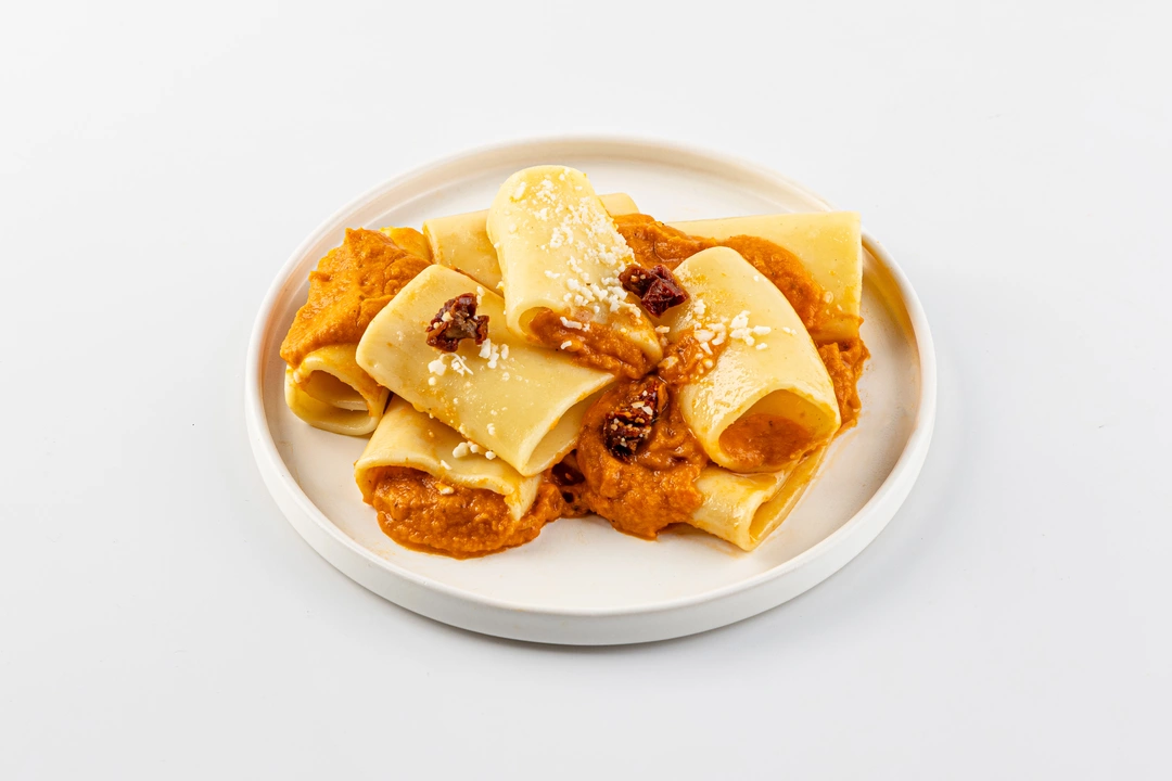 Паста по рецепту итальянского шеф-повара Паоло Бокколини, в которой сочетаются простые ингредиенты и насыщенный средиземноморский вкус. Для этого блюда мы использовали продукты, привезенные прямо из Италии. Крупные трубочки паккери приготовлены из пшеницы твёрдых сортов и пропитаны густым соусом из трёх видов томатов: свежих, консервированных и вяленых в масле. Они создают гармонию кислинки, сладости и глубины вкуса. Базилик добавляет аромат свежести, а пармезан завершает композицию лёгким солоновато-сливочным послевкусием. Это тёплое, сбалансированное блюдо, в котором чувствуется дух итальянской кухни.