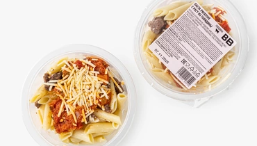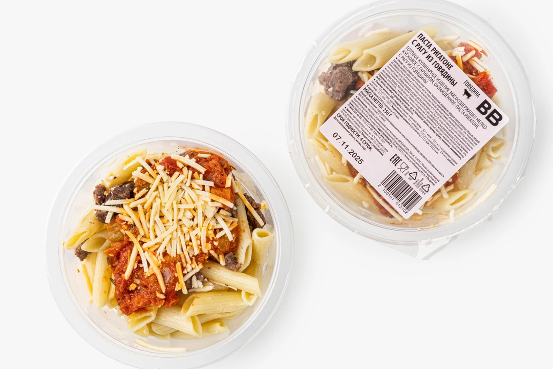Отварная паста в форме крупных трубочек с рагу из мягких кусочков говядины, тушенных с томатами, морковью, луком и сельдереем. Базилик и розмарин придают вкусу едва уловимые средиземноморские ноты, а тёртый пармезан добавляет пикантность и солоноватый акцент. Просто разогрейте продукт, следуя инструкции на упаковке, переложите в тарелку и добавьте напиток по вкусу. Такой вариант подачи напомнит о традиционных итальянских обедах, когда сытность и лёгкость сочетаются в одном блюде.