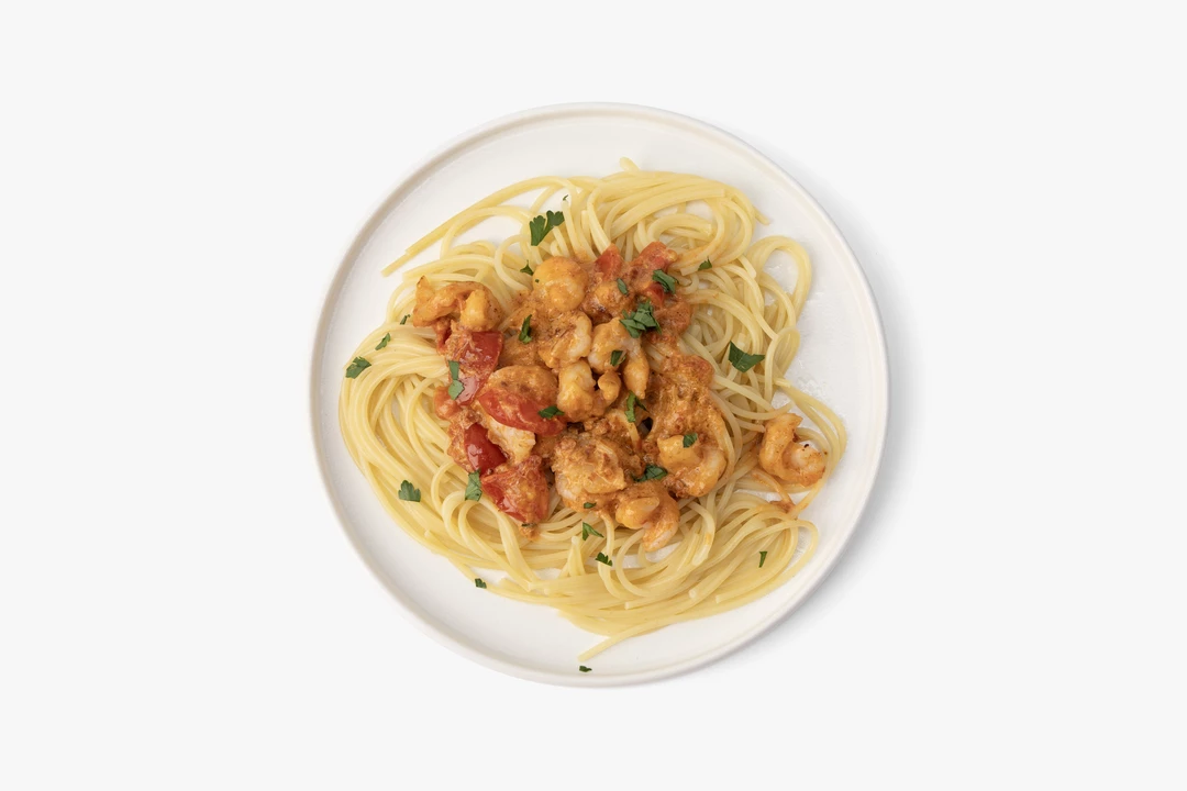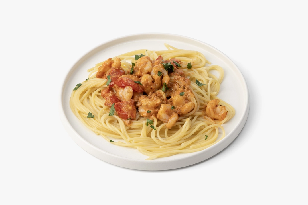 Спагетти из твёрдых сортов пшеницы покрыты томатно-сливочным соусом с мягкой кислинкой черри и сливочной нежностью. Креветки обжарены до мягкости и остаются при этом упругими и выразительными по вкусу. Брускетта из вяленых томатов с кешью добавляет соусу глубины и пряных нот, а немного петрушки и чеснока завершают композицию. Паста получается сытной, но не тяжёлой и хорошо подходит для полноценного ужина. Доступно для самовывоза из магазинов с зоной кафе.