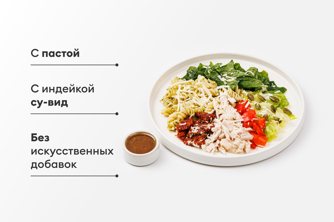 Для основы этого лёгкого и питательного блюда с богатым вкусом мы отварили пасту и заправили её ароматным соусом песто. Добавили филе индейки су-вид и запекли сладкий перец для насыщенного вкуса. Листья шпината и салат айсберг отвечают за свежесть, а вяленые томаты вносят яркие нотки. Семена тыквы и пармезан завершают композицию, придавая немного хруста и глубину вкуса. А заправка с добавлением мёда, соевого соуса и горчицы идеально вписывается в такую компанию ингредиентов и делает вкус блюда особенным.