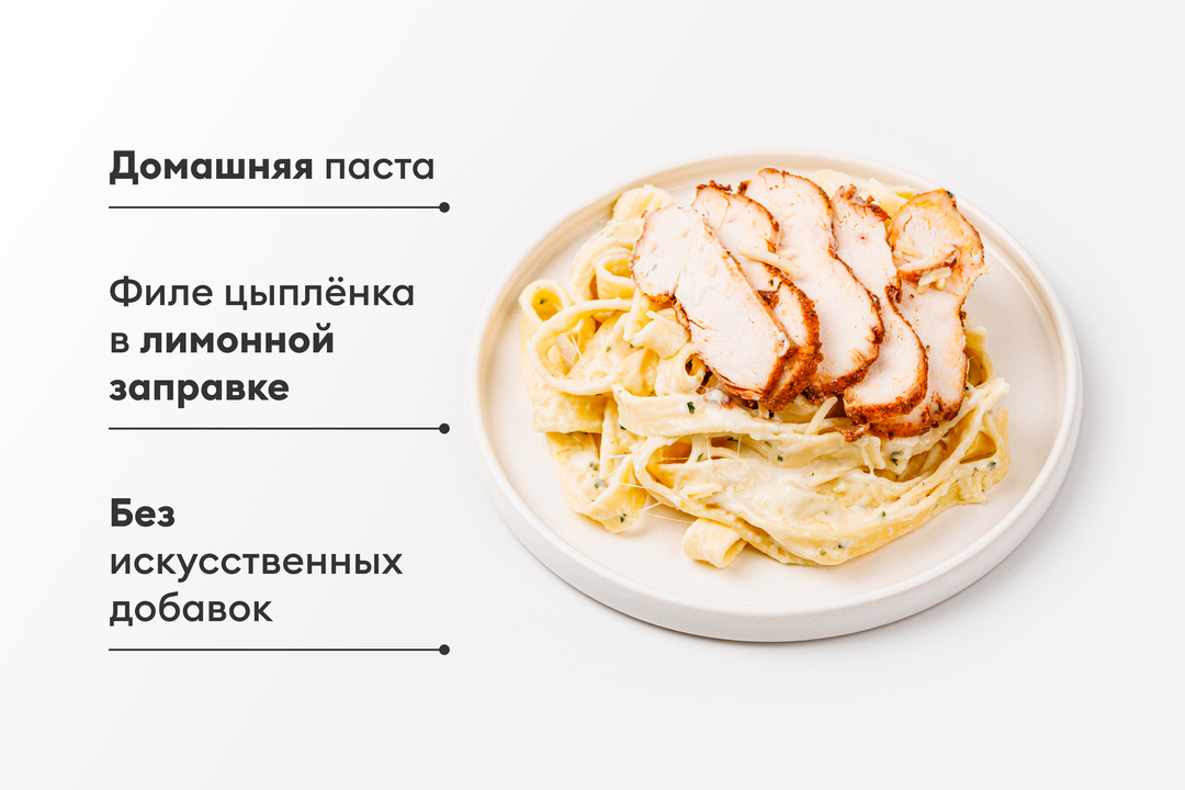 Мы приготовили домашнюю пасту с ломтиками филе цыплёнка в лимонной заправке. Состав проверен: нет усилителей вкуса, консервантов и антибиотиков