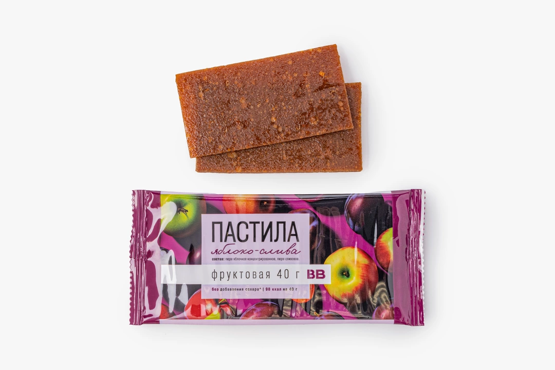 Фруктовая пастила с гармоничным сочетанием яблока и сливы. Яблочная основа даёт мягкую, упругую текстуру и лёгкую кислинку, а сливовое пюре добавляет более тёмный оттенок и насыщенный вкус. Сладость получается естественной, без приторности — за счёт самих фруктов, рафинированного сахара в составе нет. Удобный формат подойдёт для перекуса в дороге, в школе или на работе.