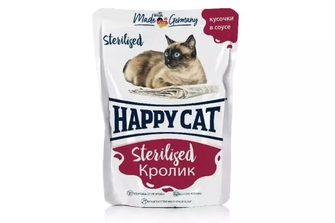 Паучи Happy Cat Sterilised для стерилизованных кошек, кусочки в соусе с кроликом 85гр / Супермаркет