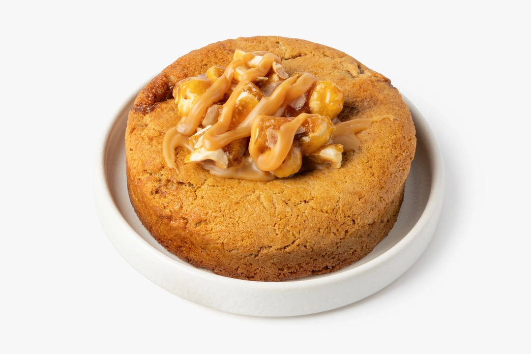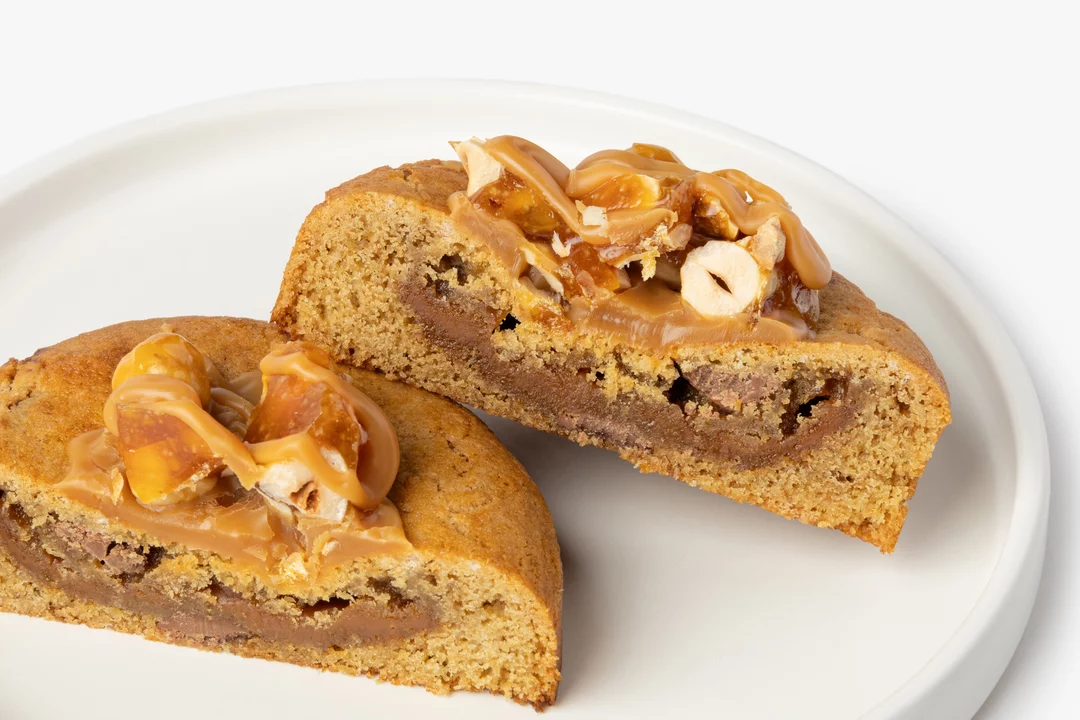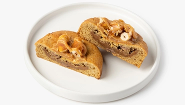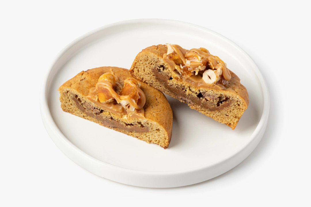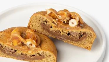 Хрустящее печенье с кусочками карамелизированного фундука. В нём сочетаются разные текстуры и насыщенный ореховый вкус. В основе — песочное тесто с добавлением тростникового сахара, который придаёт лёгкие карамельные ноты и чуть более глубокий оттенок сладости. Ядра фундука в сахарной глазури остаются плотными и приятно хрустят. Дополняют картину кусочки молочного и белого шоколада.