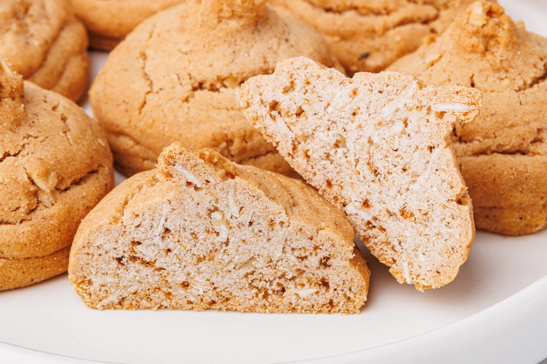 Хрустящее печенье с ароматом домашнего штруделя — яблоко и корица создают это уютное сочетание вкусов. В составе нет глютена: вместо пшеничной муки используем рисовую, гречневую и льняную. Сироп топинамбура придаёт мягкую сладость, а овсяные хлопья делают текстуру чуть более плотной и зернистой. Подходит для лёгкого перекуса, особенно в паре с чаем или тёплым молоком.