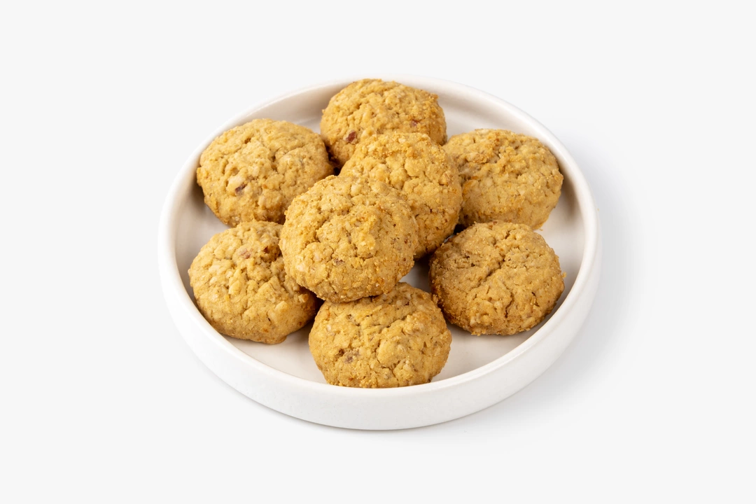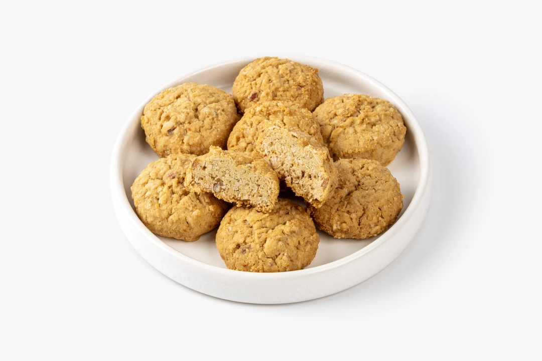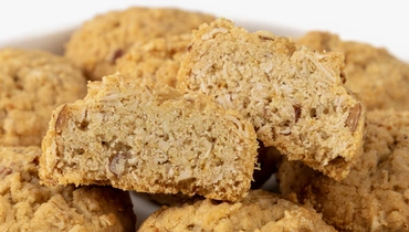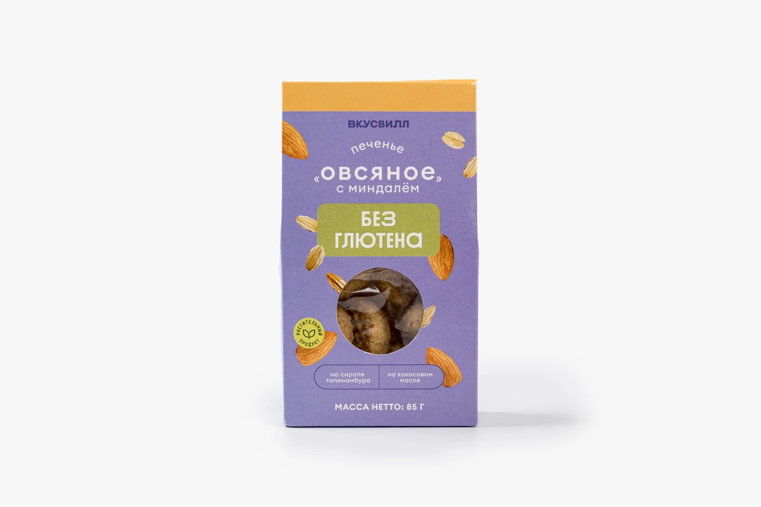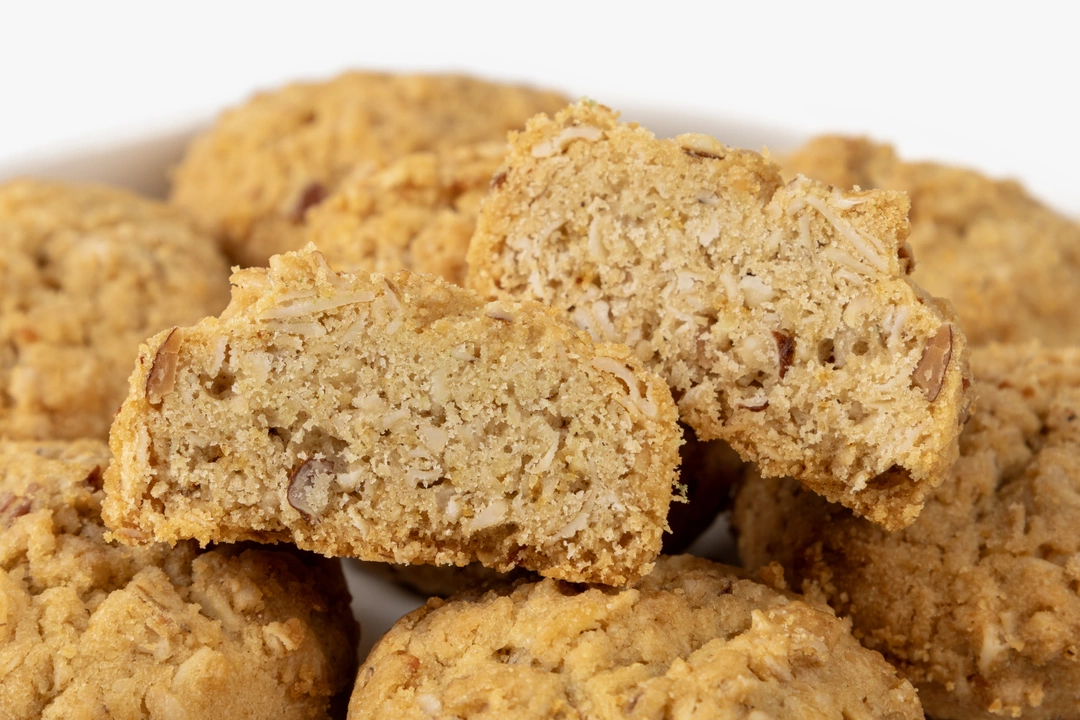 Безглютеновое печенье с золотистым хрустящим краем и чуть влажным мякишем, выпеченное из овсяных хлопьев и кокосовой мякоти. Сладкий вкус лакомства сбалансирован злаковыми нотами, а миндаль придаёт аппетитные ореховые оттенки. Достаточно сытное, это печенье станет прекрасным дополнением к завтраку и чаепитию, а небольшую упаковку удобно брать с собой для перекуса в дороге.