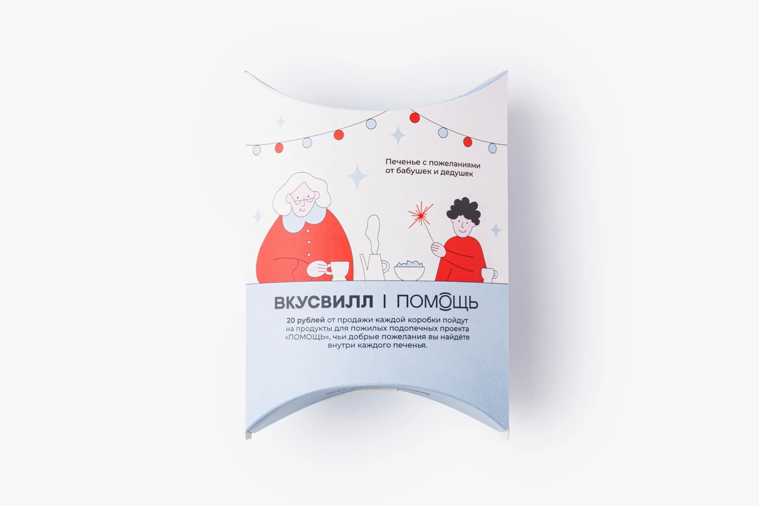 Чудес хочется всегда. Поэтому мы испекли для вас это особенное печенье, чтобы в любой день можно было добавить чуть больше волшебства. В каждой коробочке — три хрустящих печенья с тёплыми пожеланиями, написанными пожилыми подопечными проекта «ПОМОЩЬ». Упаковка оформлена добрыми иллюстрациями, а само печенье приготовлено из простой и понятной смеси муки, сахара, воды, кокосового масла и яичного меланжа. 20 рублей от продажи каждой коробки пойдут на продукты для подопечных проекта. Кроме того, вы поддерживаете наш проект «Добрая полка», помогающий благотворительным организациям продавать собственную уникальную продукцию.