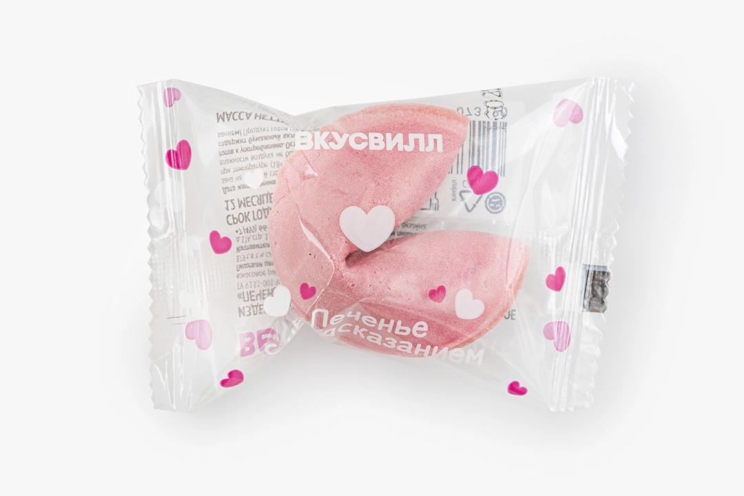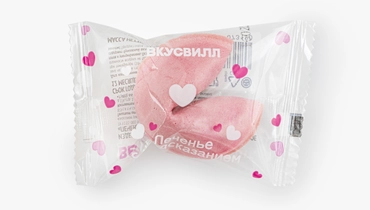 Небольшое печенье нежного розового цвета с вложенным предсказанием. Тонкое, хрустящее, не приторное, оно дополняется бумажной запиской внутри, которая делает момент особенным. Печенье удобно разломить, чтобы прочитать напутствие и съесть с чаем или кофе. Розовая упаковка с сердечками выглядит аккуратно и празднично. Подойдёт для комплимента или небольшого сюрприза.