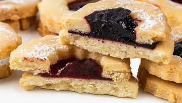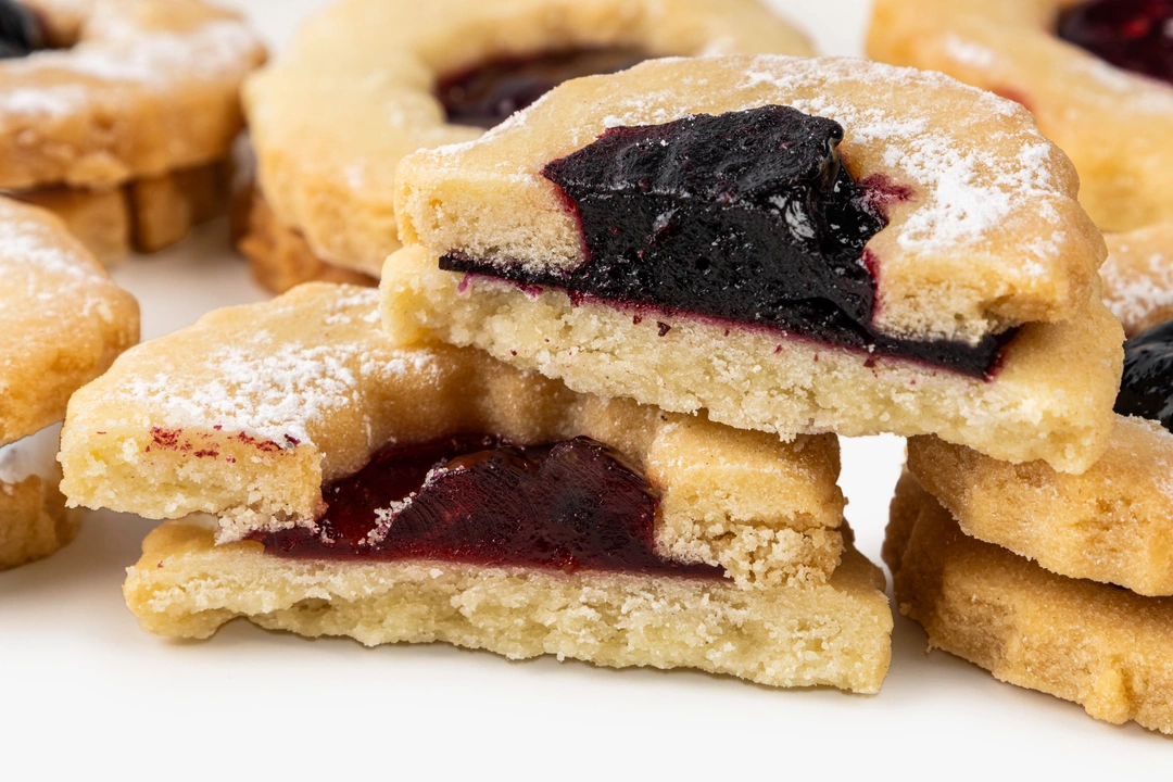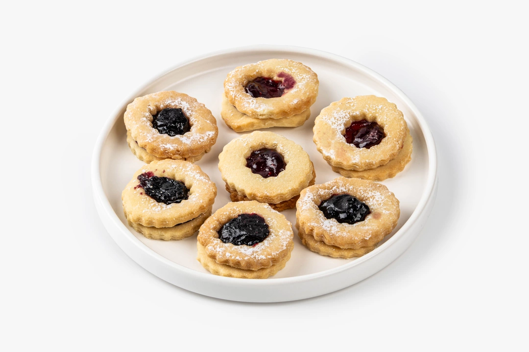 Свежее песочное печенье-сэндвич с мармеладно-тягучим ягодным джемом. Прекрасное дополнение вашего сладкого чаепития.