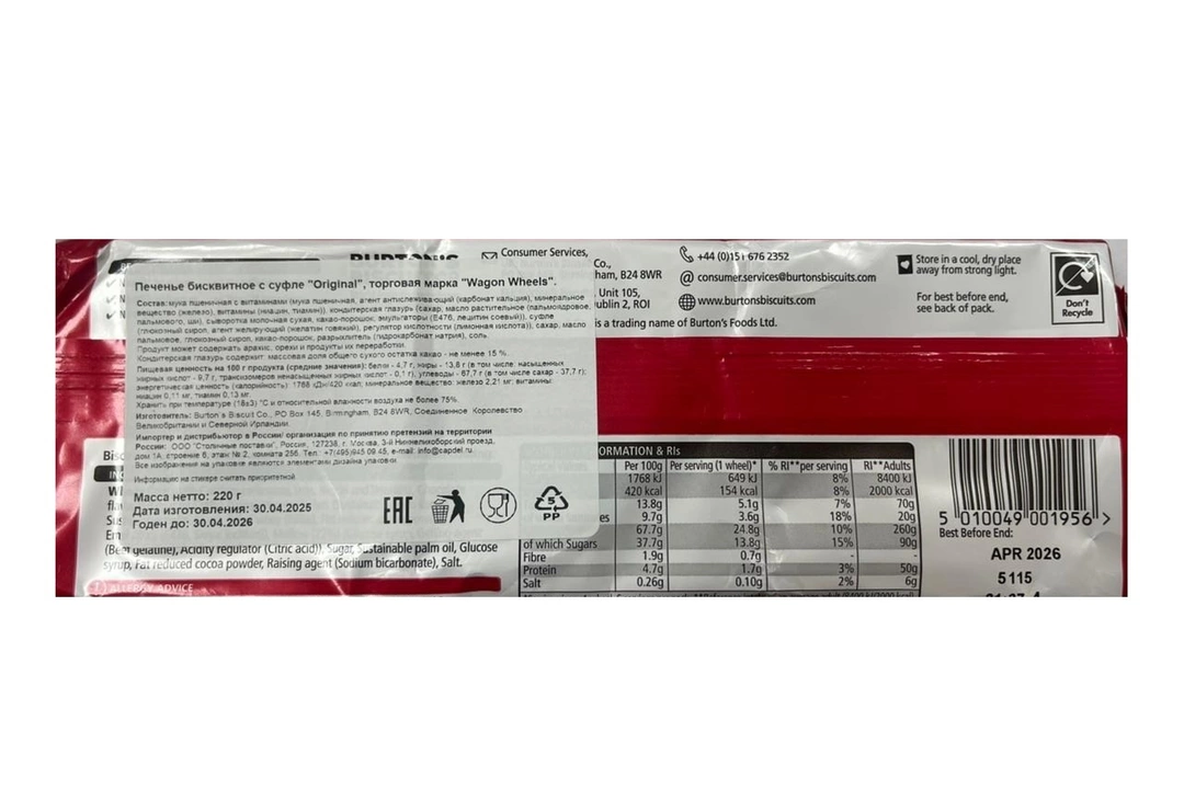 Легендарное бисквитное печенье Wagon Wheels с суфле – это классическое английское лакомство, которое завоевало популярность во многих странах мира. В упаковке содержится 6 штук печенья, представляющих собой два хрустящих бисквита, соединенных нежной начинкой из маршмеллоу и покрытых аппетитной шоколадной глазурью. Благодаря индивидуальной герметичной упаковке каждое печенье удобно брать с собой в качестве перекуса. Страна-производитель Соединенное Королевство