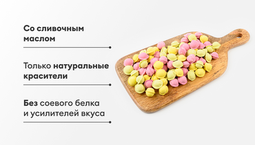 Особенно нежный и сочный вкус пельмени приобретают благодаря добавлению сливочного масла. Используем только натуральные красители для яркого цвета. Состав проверен: нет соевого белка и усилителей вкуса. Быстро варятся благодаря микроформе