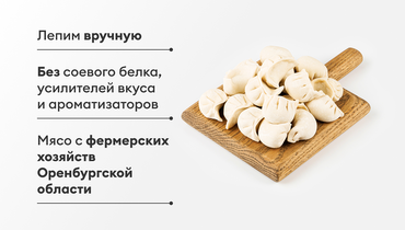 Пельмени слеплены вручную. Используем для начинки мясо с фермерских хозяйств. Состав проверен: нет соевого белка, усилителей вкуса и ароматизаторов