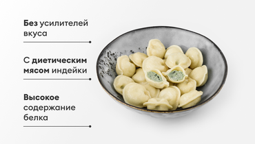 Сытные пельмени с начинкой из диетического мяса индейки, тянущейся моцареллы, рикотты и шпината. Состав проверен: без соевого белка и усилителей вкуса