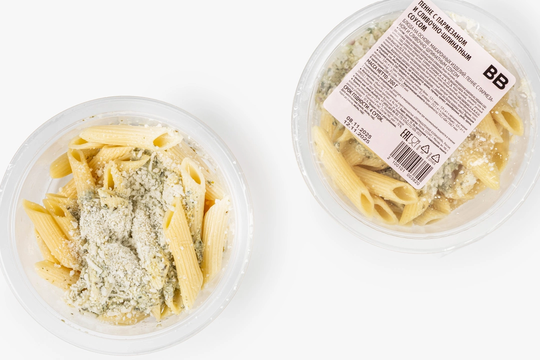 Традиционные перья из твёрдых сортов пшеницы с нежным соусом и сыром. Сливки добавляют заправке мягкости, а шпинат придаёт ей свежий оттенок. Тёртый пармезан плавится при нагревании и делает блюдо слегка солёным и пикантным. Продукт хорош как готовое решение для обеда или ужина, когда нет времени приготовить еду самостоятельно. Просто разогрейте его в микроволновой печи и наслаждайтесь классической пастой в ароматном соусе, как в лучших ресторанах Италии.