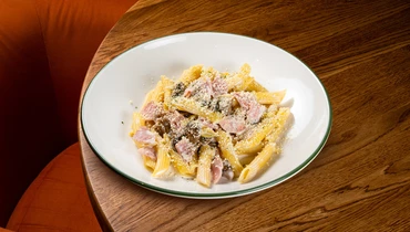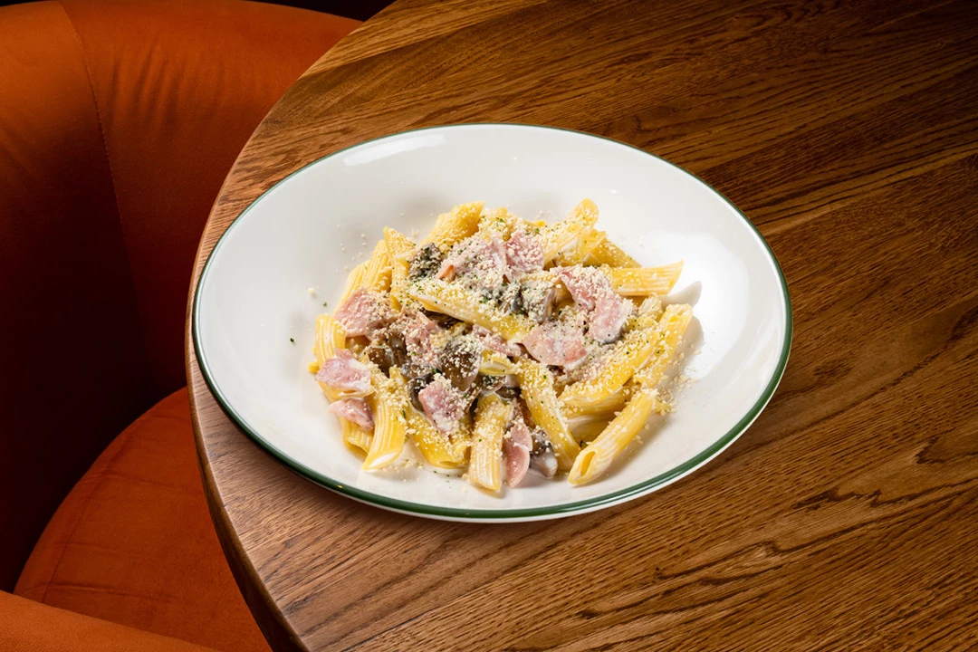 Паста с шампиньонами и ветчиной в сливочном соусе.