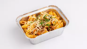 Аппетитное блюдо из сытных макарон пенне с пряным томатно-мясным соусом из говядины, сдобренный сыром пармезан.