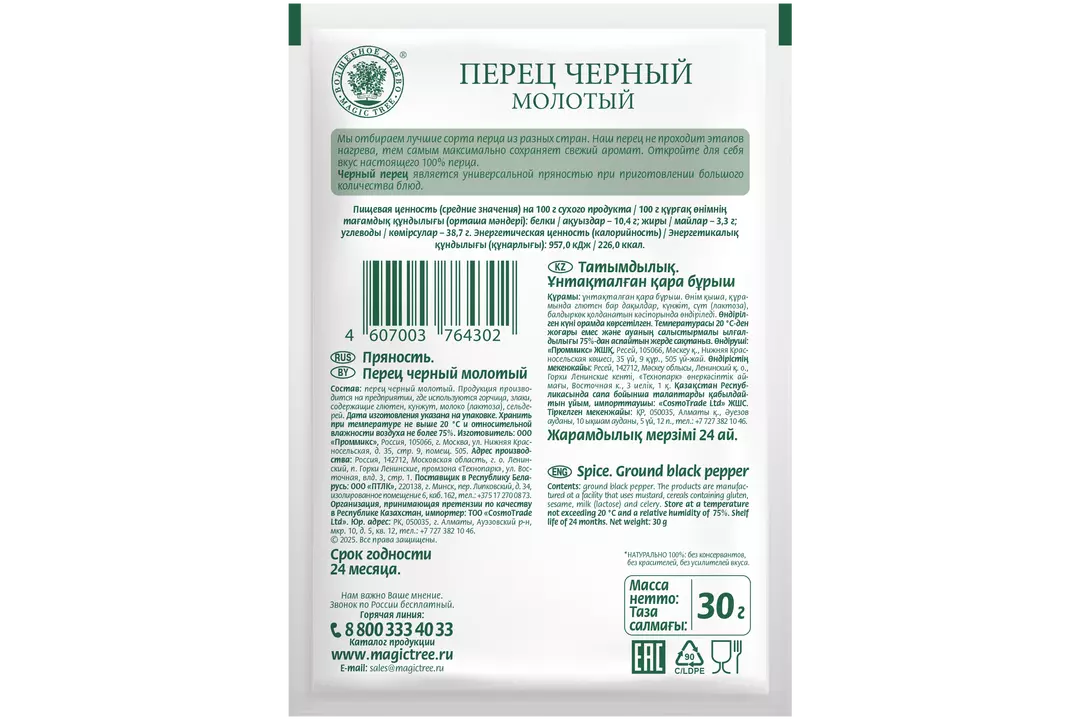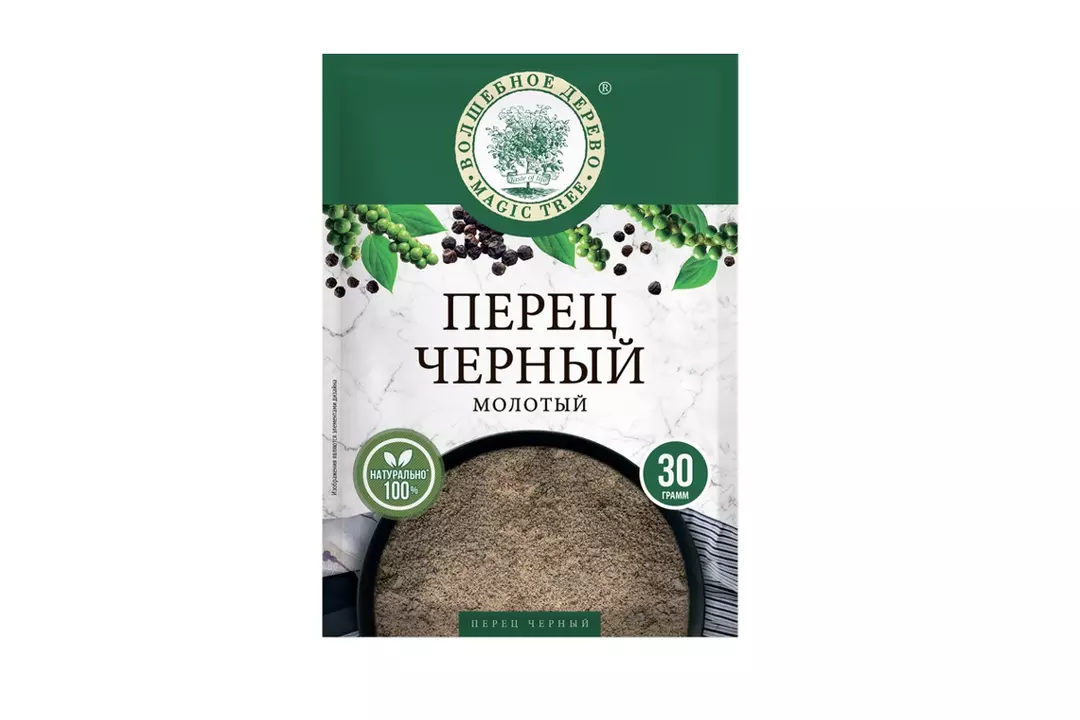 Черный молотый перец бренда «Волшебное Дерево» – это одна из самых популярных пряностей в кулинарии, которая производится путем помола сушеных ягод черного перца. Он отлично сочетается со множеством продуктов, в том числе является неотъемлемым ингредиентом в рецептах для маринования и консервирования. Благодаря двухфакторному помолу и фольгированной упаковке мы добиваемся сохранения эфирности перца, подчеркиваем его аромат и остроту. Страна-производитель Россия