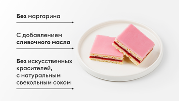 Пирожное из рассыпчатого, нежно хрустящего песочного теста, покрытого кисло-сладким бруснично-клубничным повидлом. Сверху — тающая на языке глазурь, аппетитно подкрашенная натуральным свекольным соком. Вкусно, совсем как у бабушки. Замечательный десерт к чаю, кофе или тёплому молоку.