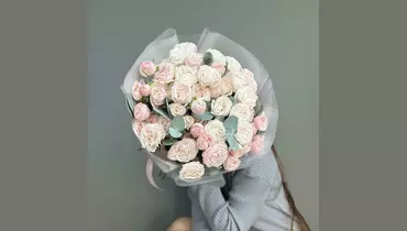 Эвкалипт - 4 шт. Лента атласная - 1 шт. Роза кустовая пионовидная - 15 шт. Пленка матовая - 5 шт.