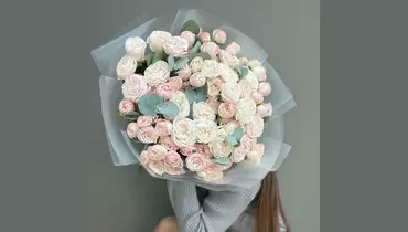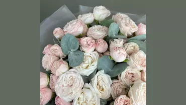 Эвкалипт - 5 шт. Лента атласная - 1 шт. Роза кустовая пионовидная - 25 шт. Пленка матовая - 7 шт.