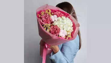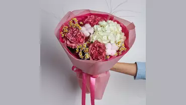 Пионовидные розы и гортензия в букете «Клюквенный джем» FMART by flowwow