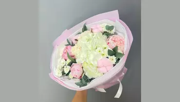 Нежный букет с пионами и гортензией покорит сердце любой девушки и создаст романтичное настроение. Не забудьте подрезать цветы перед тем как ставить в вазу (после подрезки в течении 2-3 секунд поставьте в воду). Не храните букет на прямых солнечных лучах и возле отопительных приборов, чтобы сохранить цветы свежими как можно дольше. К каждому нашему букету мы приложим открытку с вашими пожеланиями, инструкцию по уходу за букетом и специальную подкормку для цветов. Состав: Гортензия-1 шт Пион-3 шт. Хлопок -3 шт Диантус-3 шт Сантини-3 шт Эвкалипт пучок-1 шт