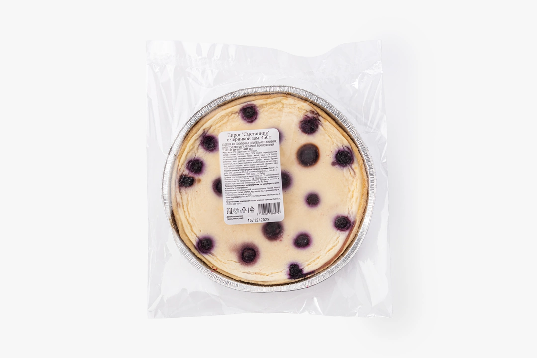 Сметанник на основе мягкого творога и сметаны с черничной начинкой. Нежная песочная основа и ягоды. Замороженный продукт, перед подачей необходимо разморозить.