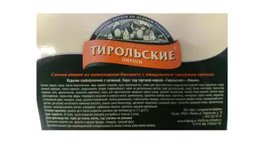 Спелая вишня на шоколадном бисквите с миндальным заварным кремом. Страна производитель-Россия