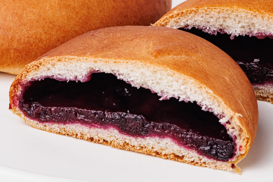 Пирожки из дрожжевого теста с фруктово-ягодной начинкой. Внутри цельные ягоды черники и яблоки, нарезанные кубиками. В упаковке 2 штуки.