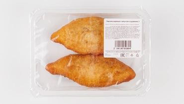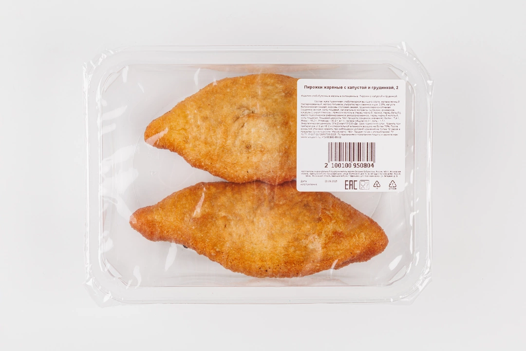 Жареные пирожки с капустой и варёно-копчёной грудинкой. Тесто на молоке и яйцах, с поджаристой корочкой. Начинка из тушёной капусты с морковью и кусочками грудинки. В упаковке 2 штуки.