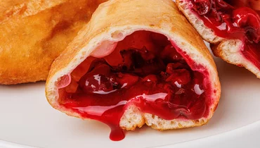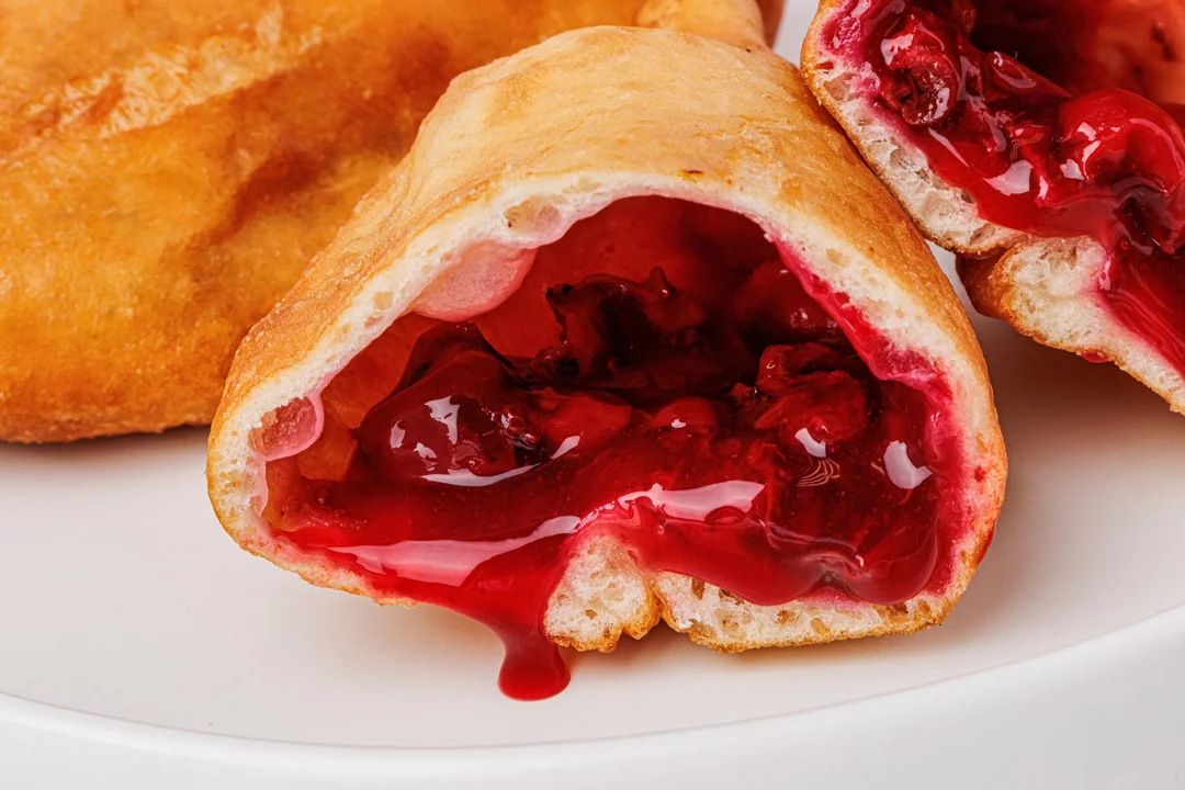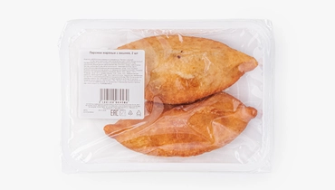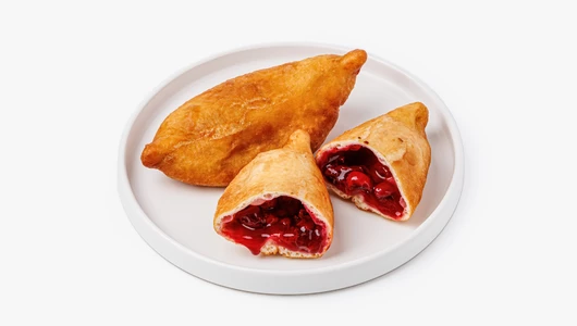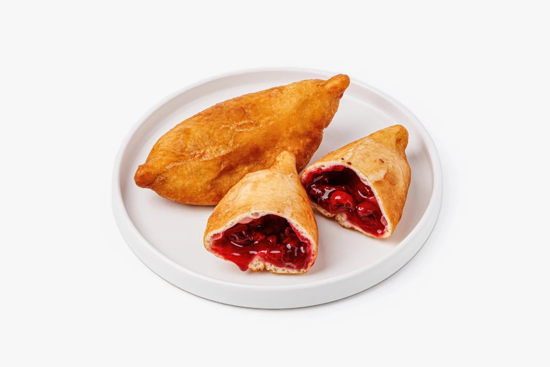 Пирожки с вишнёвой начинкой обжарены до румяной корочки. В упаковке 2 штуки.