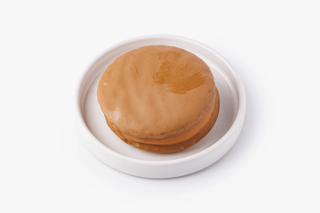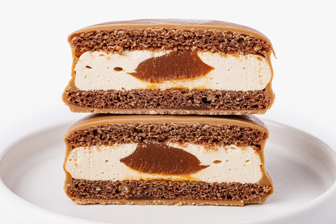 Пирожное на безглютеновой основе с гречишными семенами, воздушным суфле и карамельной начинкой. Рисовая, амарантовая и льняная мука создают нежную текстуру бисквита, а сироп топинамбура с кокосовым сахаром добавляют натуральную сладость. Воздушное суфле на аквафабе сочетается с шоколадной глазурью на какао-масле и кешью.