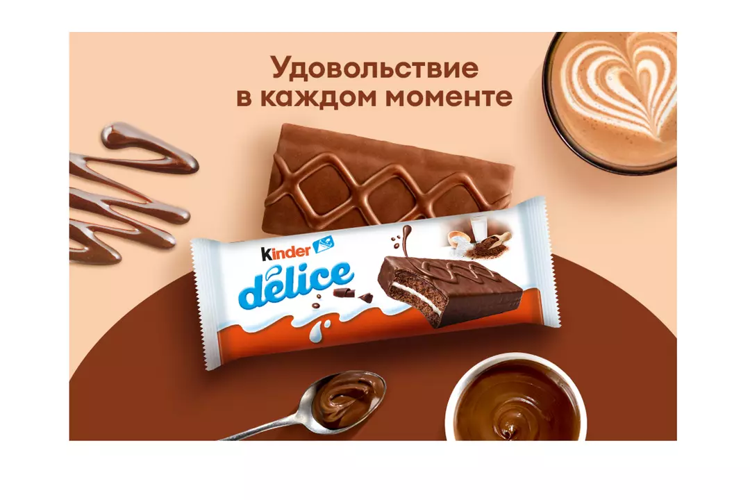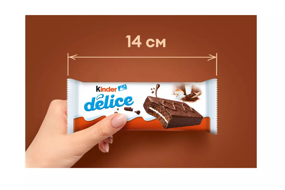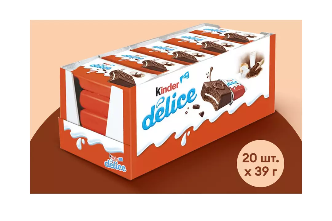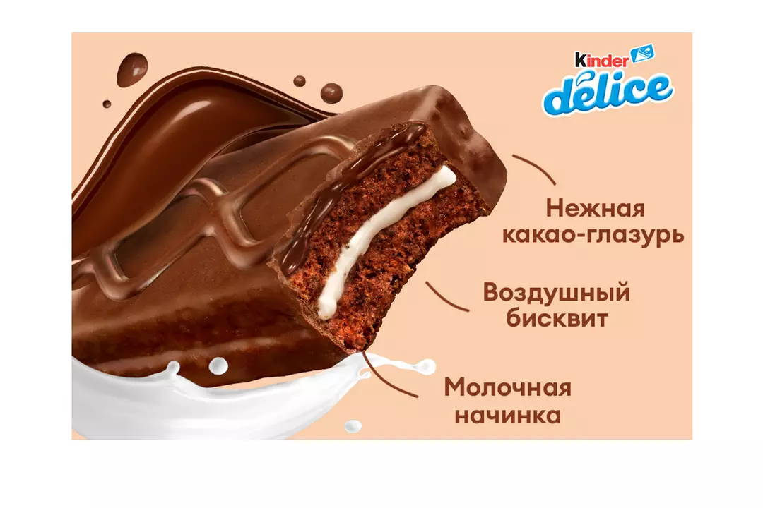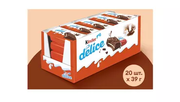Kinder Delice - пирожное с молочной начинкой, покрытое какао-глазурью. Насыщенный шоколадный вкус бисквита гармонично дополняет мягкий молочный крем. Небольшое пирожное удобно взять с собой в школу или на дополнительные занятия, чтобы подкрепиться в любой момент, ведь его не нужно хранить в холодильнике. Хранить при температуре от 15°C до 22°C и относительной влажности не более 65%. Страна производитель-Италия