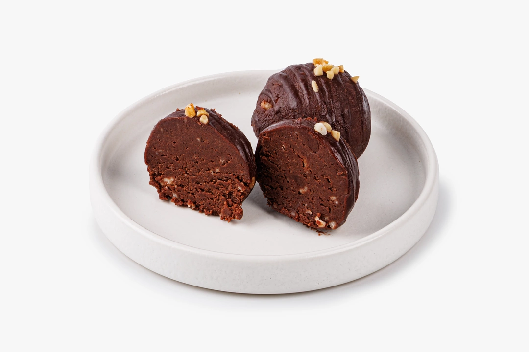Легендарная «Картошка» в веганском формате. Структура и вкус у нашего и классического десерта похожи, чего не скажешь о составе. В этом пирожном «молочку» заменяют кокосовые продукты, пшеничную муку — рисовая, кукурузная и льняная, а также перетёртые орешки кешью. Сахара в составе нет, за сладость отвечают сиропы из топинамбура и фиников. А украшает лакомство шоколадная глазурь и дроблёный арахис.