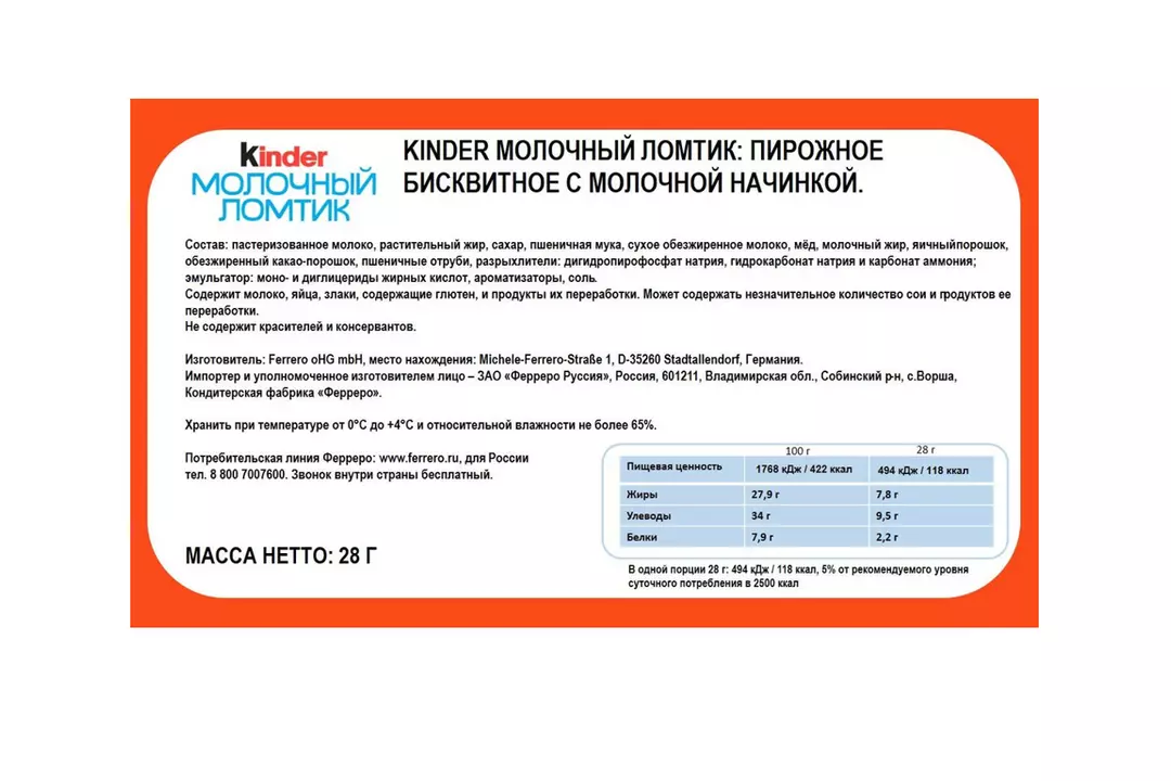 Kinder Молочный Ломтик – вкусный бисквит с молочной начинкой и добавлением меда, изготовленный по инновационным технологиям с высоким содержанием натурального молока (40%). Как все молочные продукты, Kinder Молочный Ломтик нужно хранить в холодильнике. Не содержит красителей и консервантов. Страна-производитель Германия