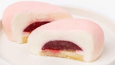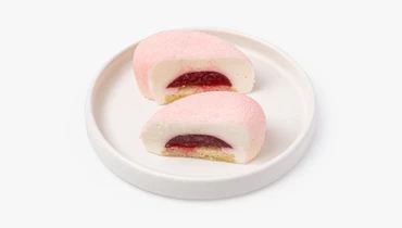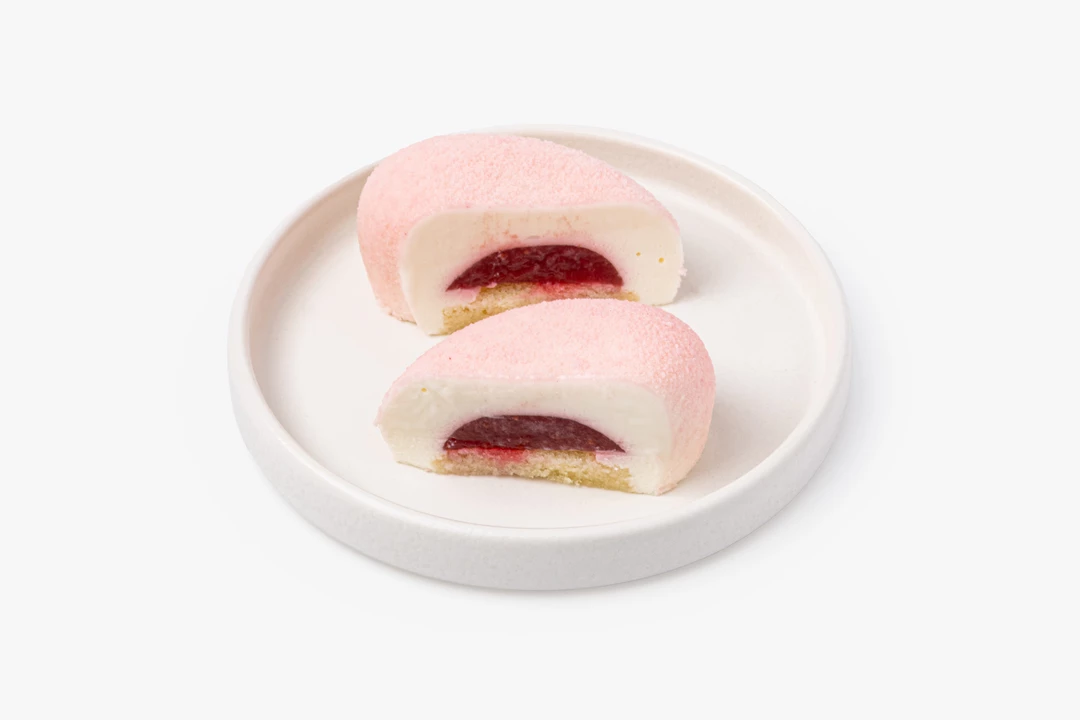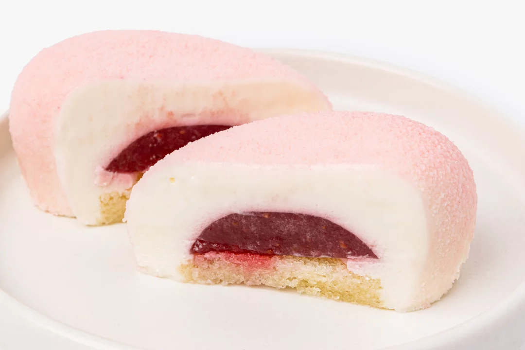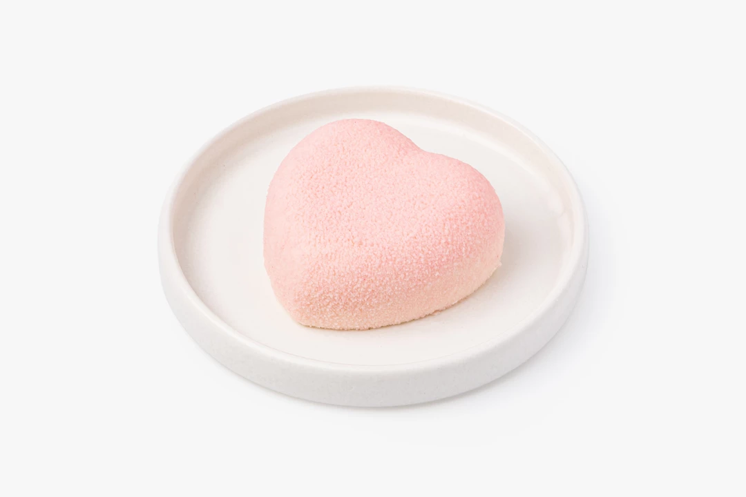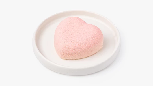 Пирожное в форме сердца из йогуртового мусса. Внутри тонкий слой мягкого бисквита и ягодная начинка из малины и клубники.