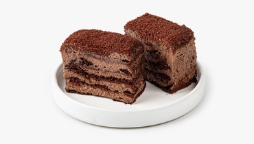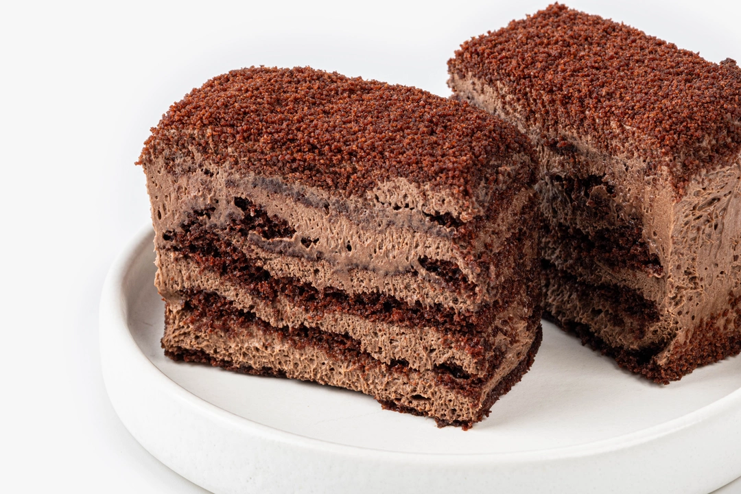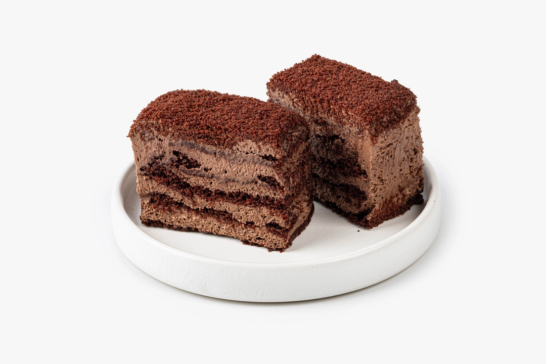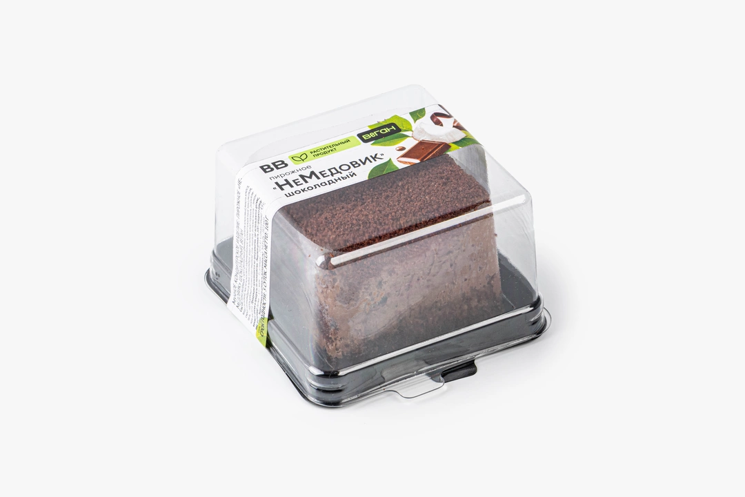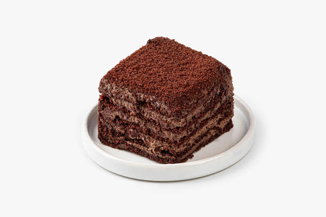 Воздушное шоколадное пирожное с мягкими коржами на полбяной муке. Дополнено кремом на кокосовой основе. Вместо сахара использовали сироп топинамбура и финиковый. Не содержит продуктов животного происхождения.