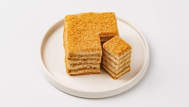 Нежный медовик в веганском исполнении, испечённый на основе полбяной муки и кокосовой мякоти. Вместо сахара мы используем сиропы: фиников и топинамбура. Именно они придают десерту округлую сладость и наполняют его вкус тёплыми карамельно-медовыми нотками.