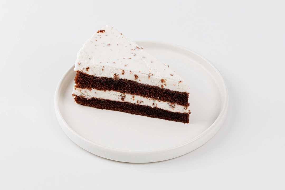 Пирожное на основе мягкого бисквита с добавлением какао. Прослойка из сырного крема с шоколадной крошкой и лёгким ванильным акцентом.
