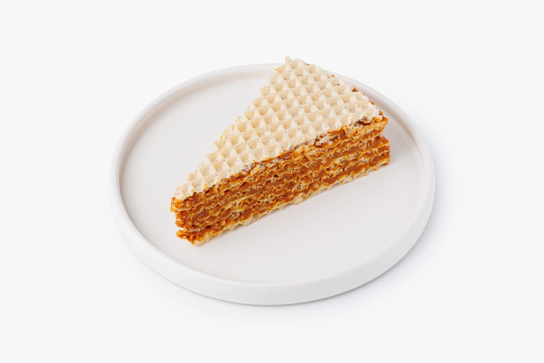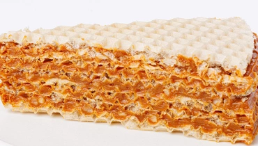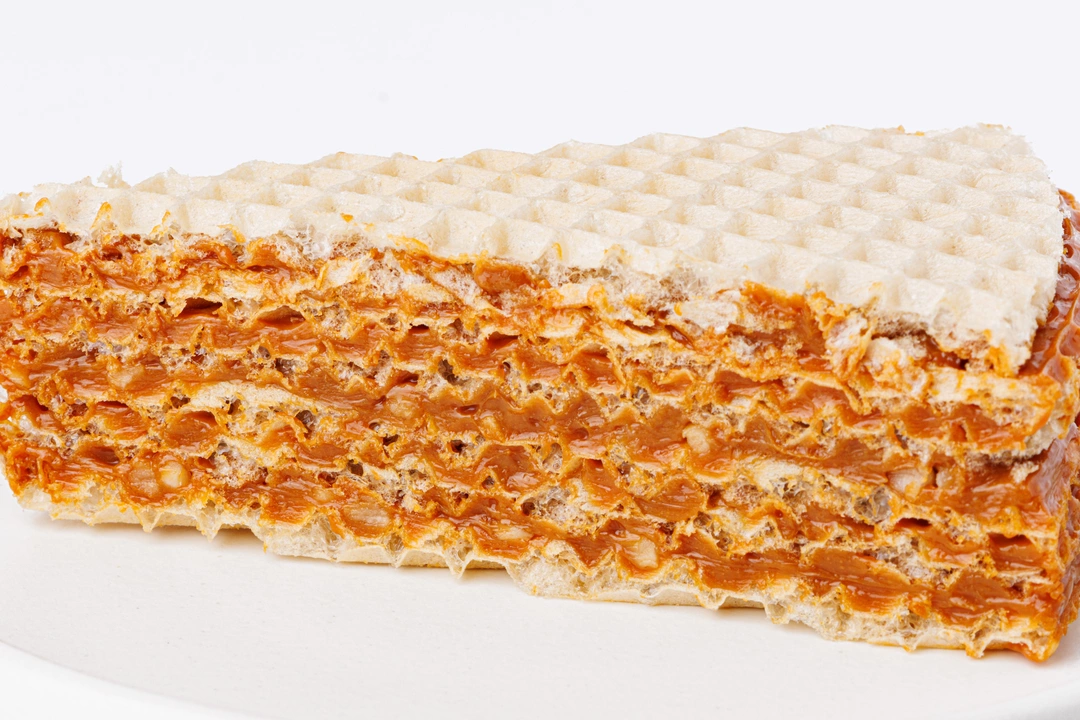 Хрустящие вафельные коржи сочетаются с густой варёной сгущёнкой и дроблёным жареным арахисом. Простое, но по-настоящему уютное пирожное с выраженным карамельным вкусом и ореховой текстурой. Подходит к чашке кофе или какао, особенно если хочется чего-то сладкого и привычного.