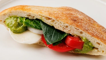 Пита с сыром и томатами — быстрый и сытный вариант перекуса. Лепёшка на картофельной основе получается мягкой и слегка сладковатой за счёт мёда. Внутри — сочные свежие томаты, тянущаяся моцарелла и ароматный соус песто с базиликом, кедровыми орехами и пармезаном. Можно разогреть в духовке или на сковороде, чтобы сыр расплавился, а лепёшка слегка подрумянилась.