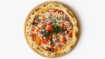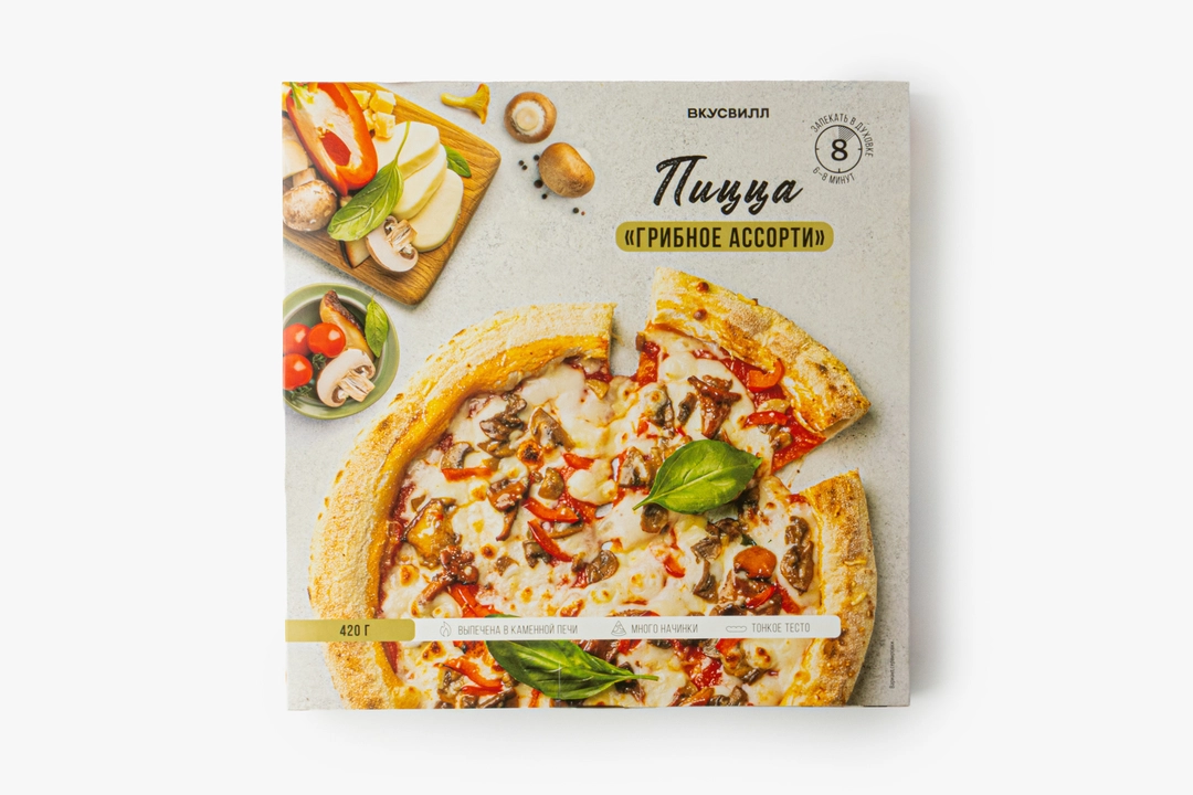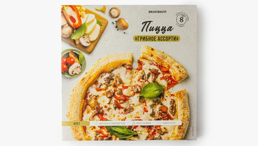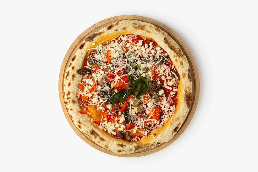 Тонкое тесто на дрожжевой основе с добавлением муки из твёрдых сортов пшеницы, томатный соус с базиликом и орегано, а сверху — три вида грибов: шампиньоны, лисички и белые, обжаренные с чесноком и чёрным перцем. Сливочная моцарелла и пикантный пармезан дополняют начинку, а сладкий перец и базилик добавляют яркости. Готовим без соевого белка, усилителей вкуса и искусственных ароматизаторов. Пицца уже выпечена в каменной печи, поэтому перед подачей будет достаточно разморозить и поставить её в духовку на несколько минут