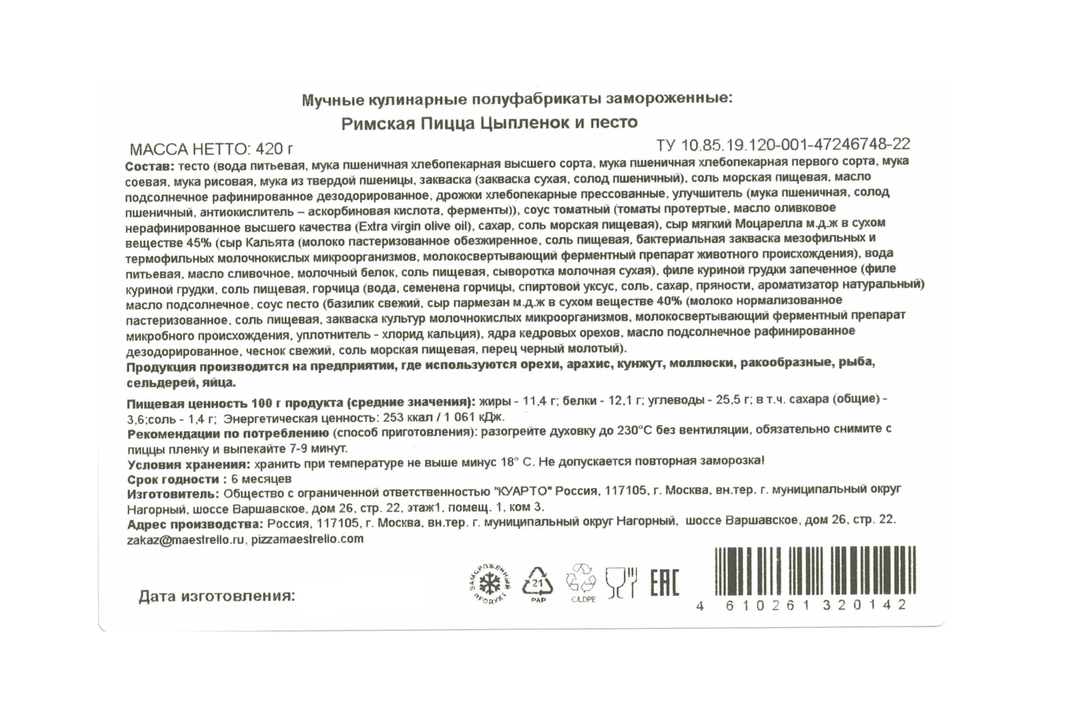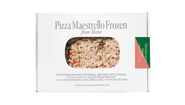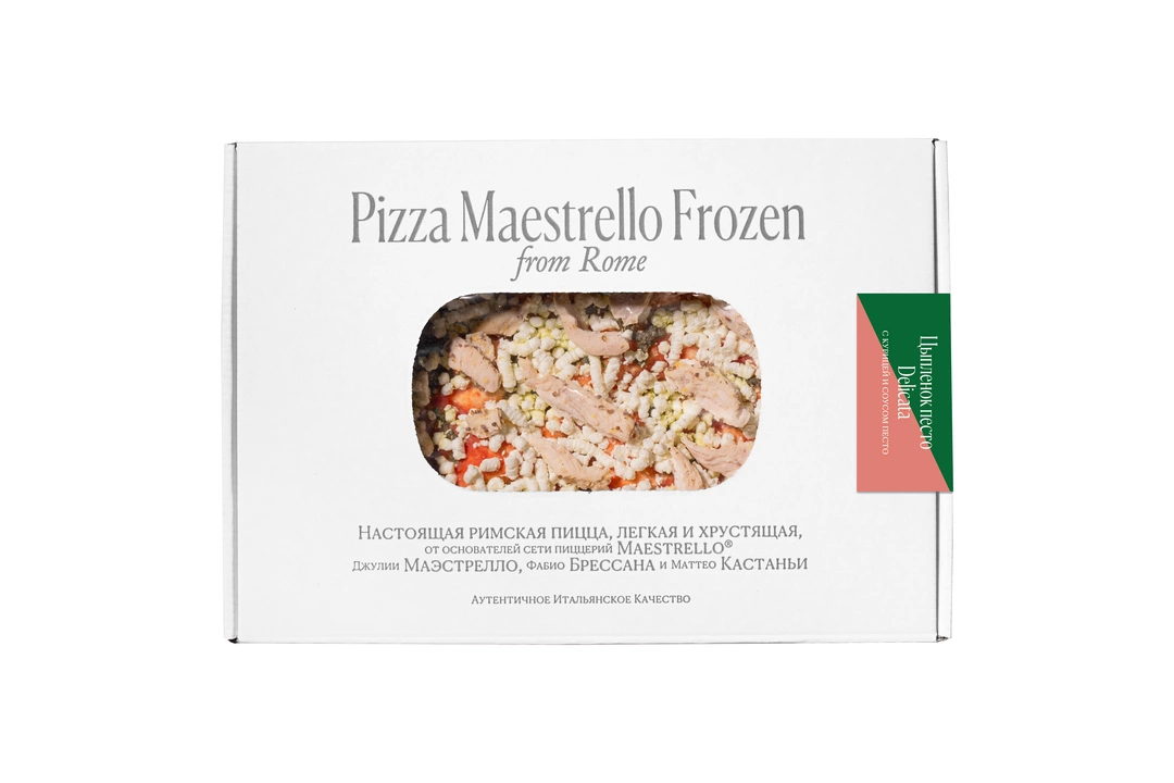 Традиционная римская пицца на тесте из трёх видов отборной муки – пшеничной, соевой и рисовой –с итальянским томатным соусом, натуральной моцареллой, курицей и домашним песто. Благодаря рецептуре и технологии приготовления пицца получается легкой и хрустящей, а в замороженном виде может храниться до 180 дней без потери во вкусе или качестве. Страна производитель-Россия