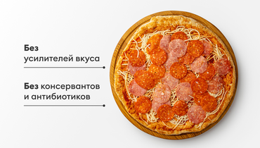 Почти готовая пицца с двумя видами сырокопчёной колбасы, нежной моцареллой и пряным томатным соусом. Нужно лишь отправить на несколько минут в духовку или СВЧ-печь. Когда сыр станет аппетитно тягучим — пиццу можно подавать к столу!