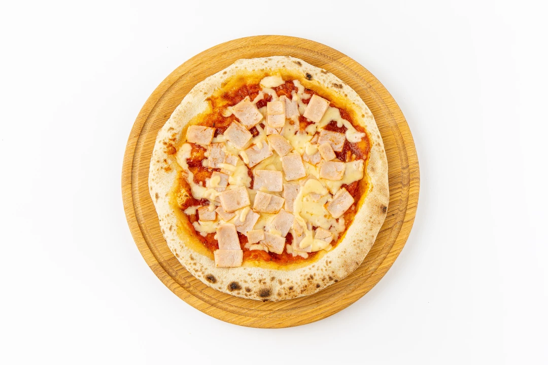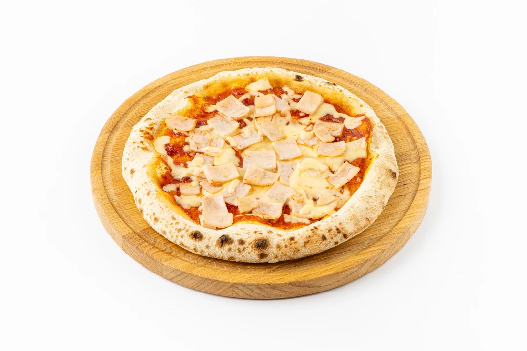 Пицца с нежной куриной ветчиной и расплавленным сыром приготовлена по классическому итальянскому рецепту. Тонкая пшеничная основа на оливковом масле получается хрустящей по краям и мягкой в серединке. Томатный соус с орегано придаёт блюду яркий средиземноморский акцент. Пицца хороша для традиционного семейного ужина или просмотра фильма в компании друзей. Продукт приедет к вам горячим и готовым к подаче.